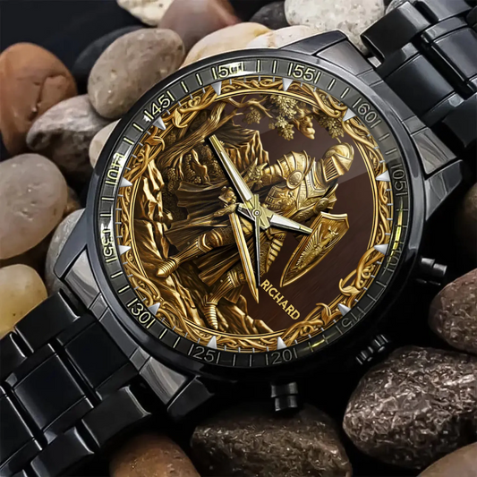 Personalized Knight Watch - Custom Name Option, Intricate Gold Knight Dial Timepiece