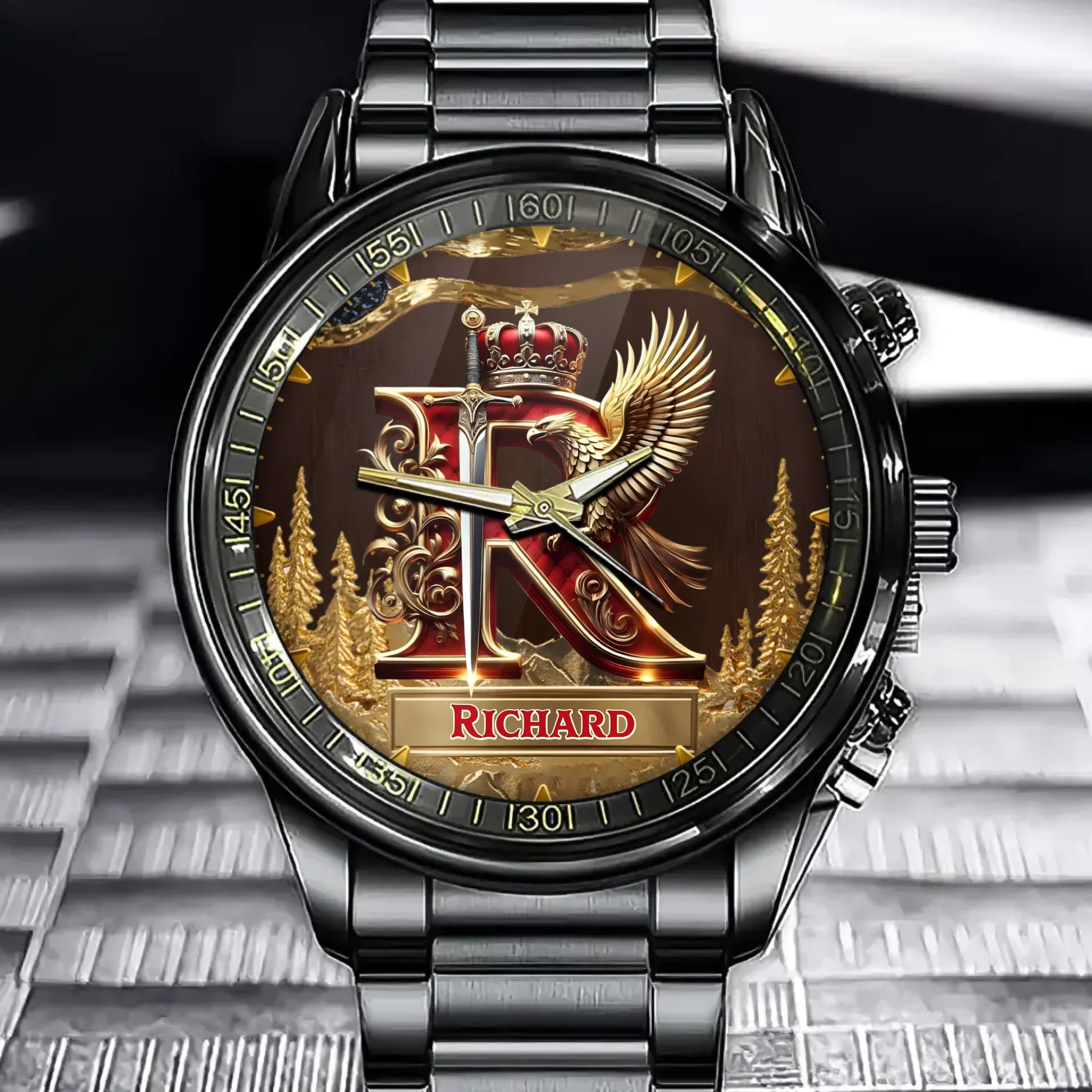 Personalized Engraved A Monogram Watch with Royal Elements - Custom Watch with Sword & Eagle Design