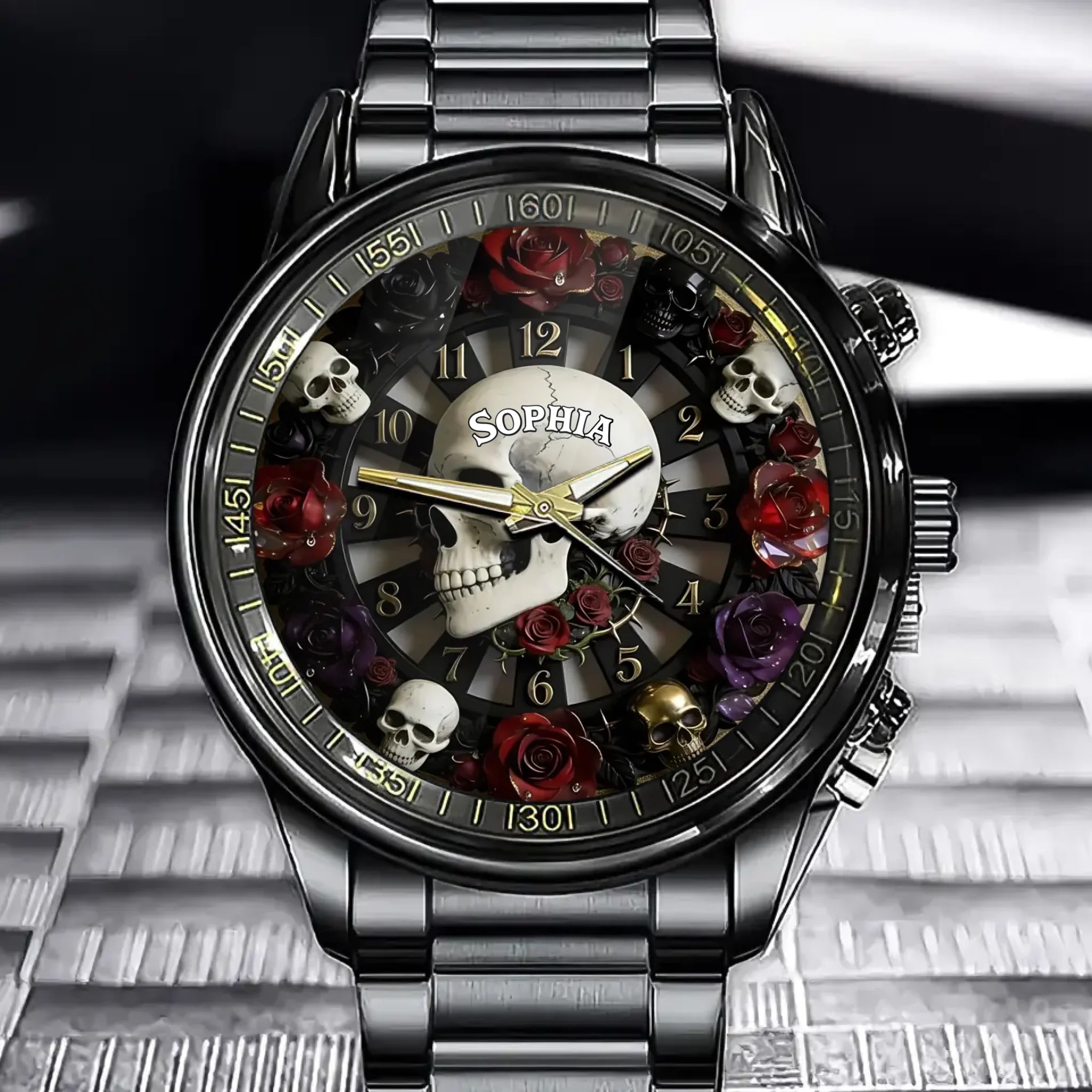 Personalized Gothic Skull Watch - Cross & Rose Design And Custom Name