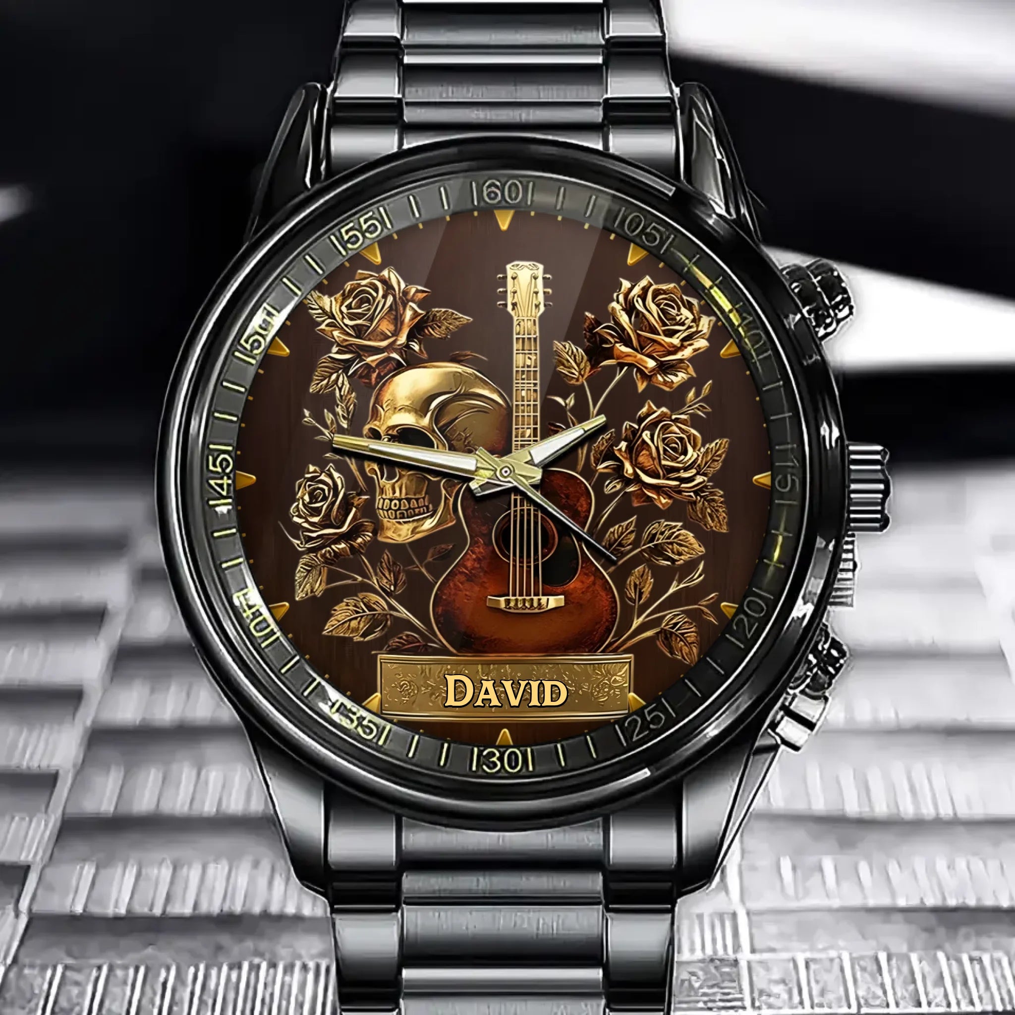 Personalized Guitar & Skull Themed Watch - Elegant Rose Accent Design with Custom Name Option