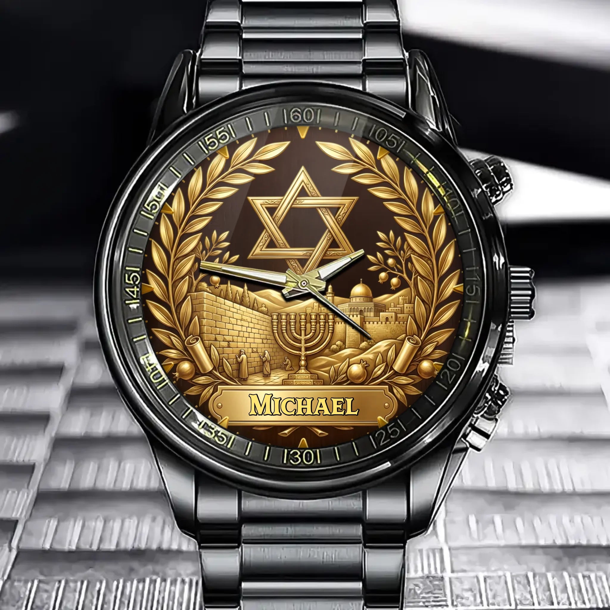 Personalized Hanukkah Heritage Watch – Custom Name Edition with Jewish Symbols