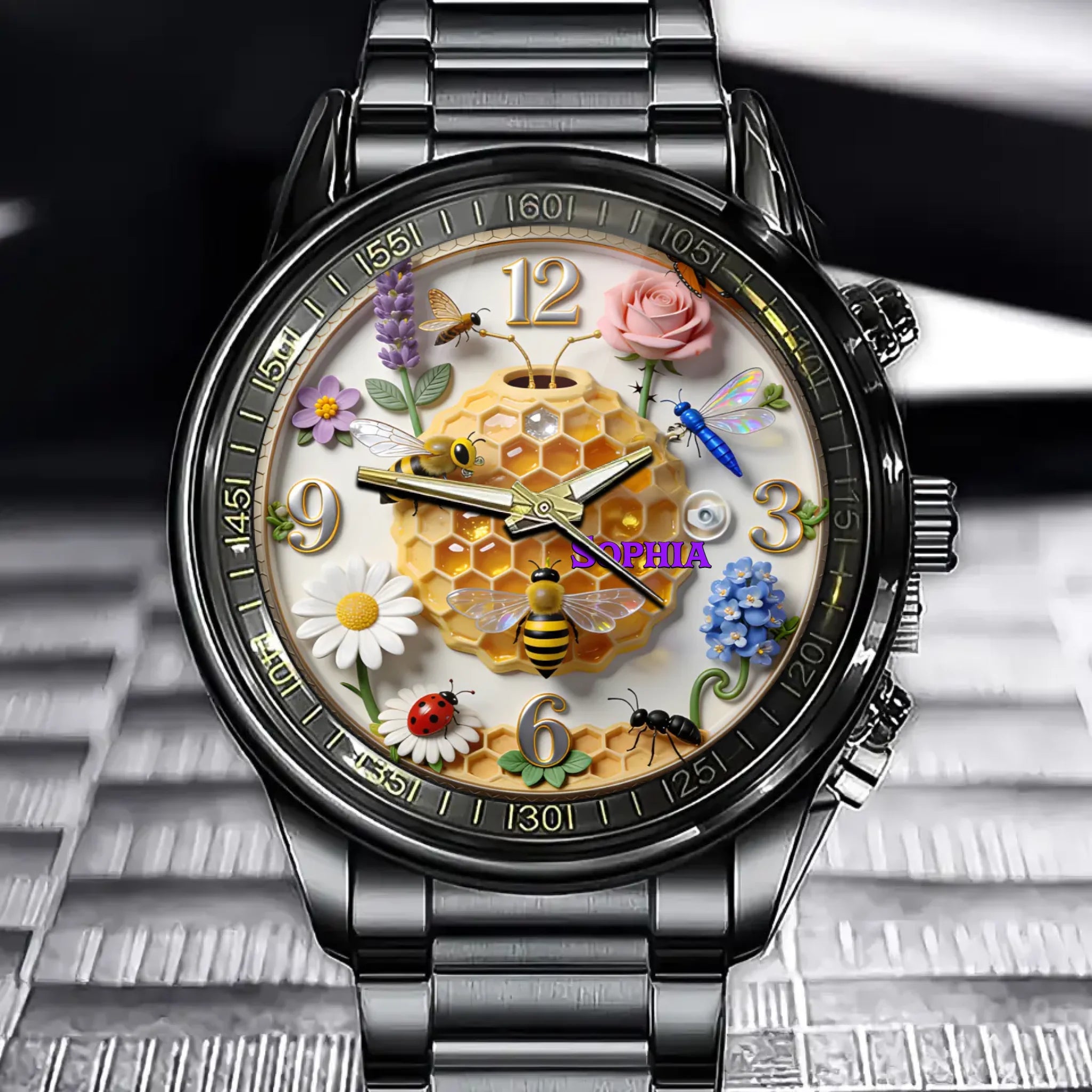 Personalized Honeycomb Watch - Featuring Floral Embellishments And Customizable Names
