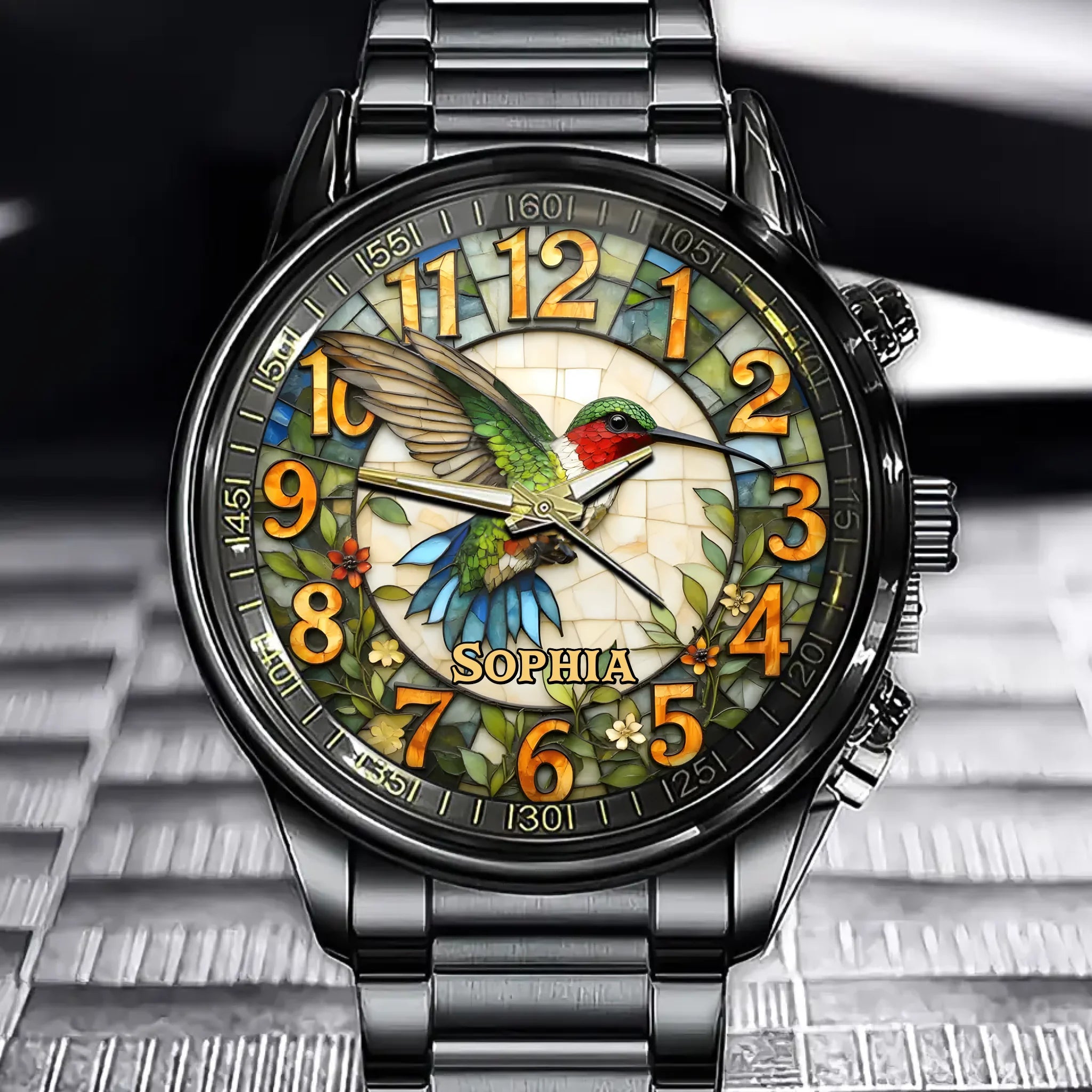 Personalized Hummingbird Stained Glass Print Watch with Custom Name