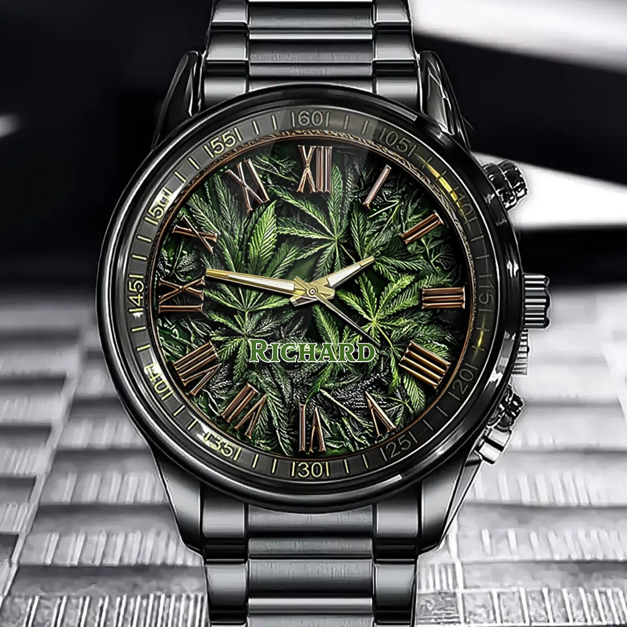 Personalized Name Engraved Watch with Cannabis Leaf Design