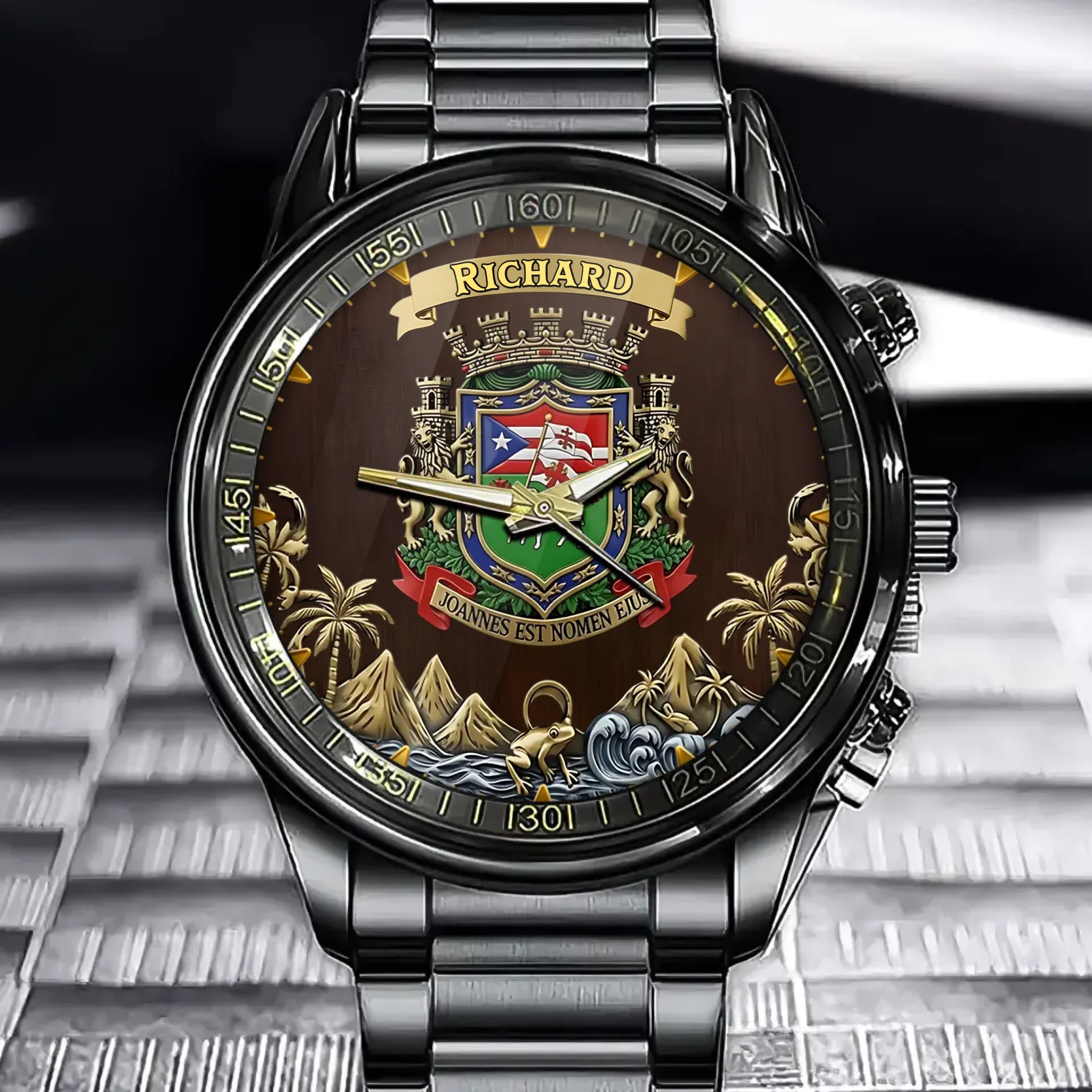 Personalized Puerto Rico National Coat of Arms Watch - "JOANNES EST NOMEN EIUS" & Castle/Lion/Palm Tree Themed Dial with Custom Name