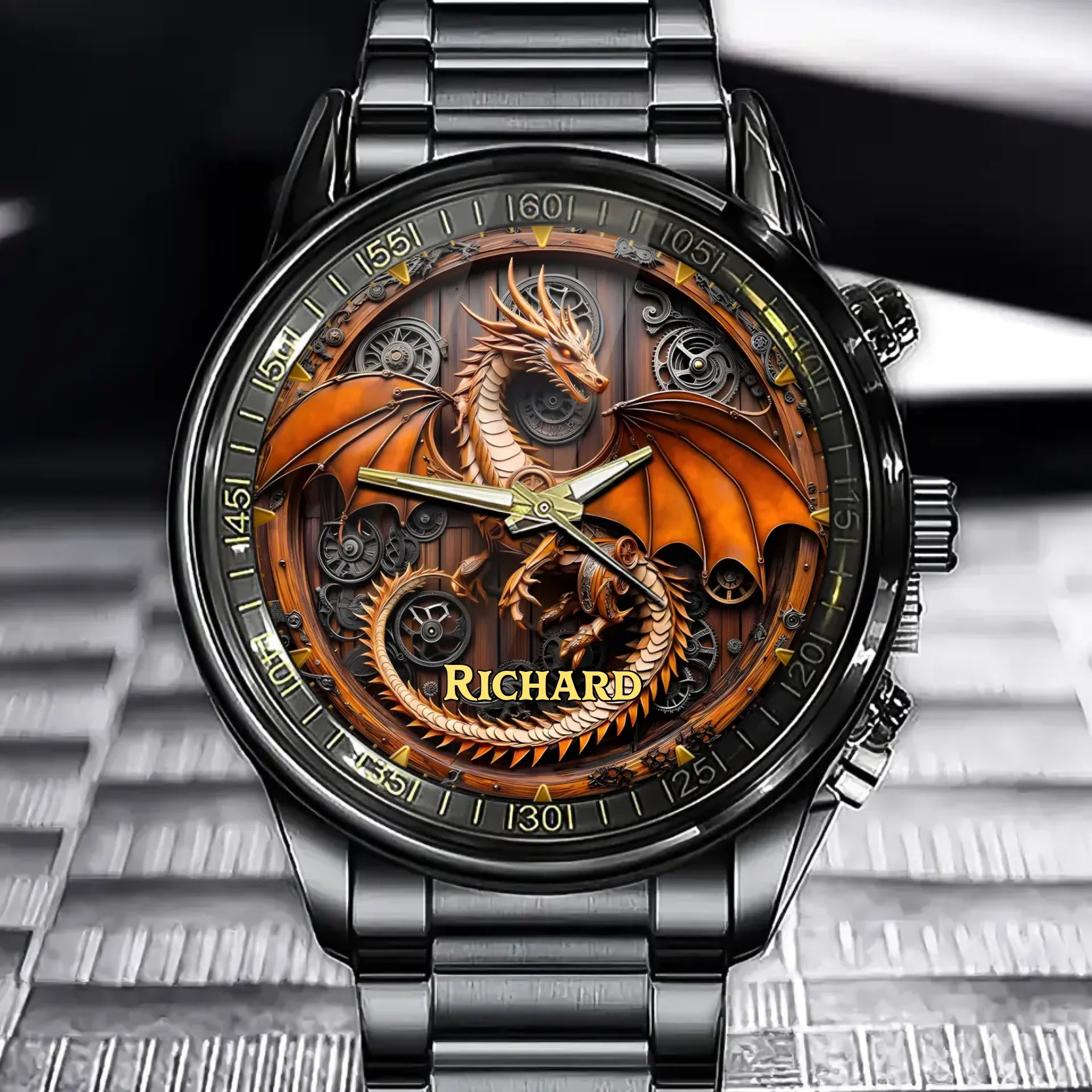Personalized Steampunk Gear Dragon Watch - Elaborate Dragon Design with Custom Name