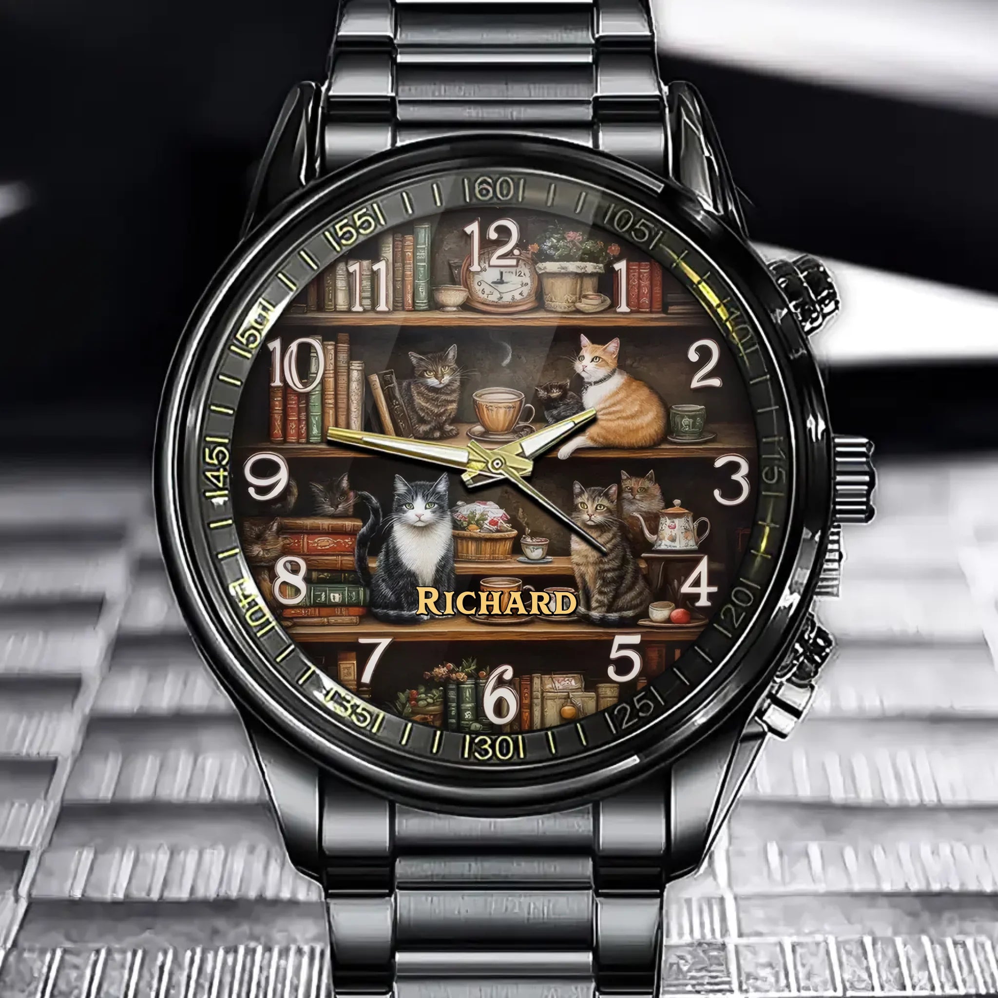 Personalized Vintage Cat and Bookshelf Watch - Add Your Name for a Unique and Cozy Touch