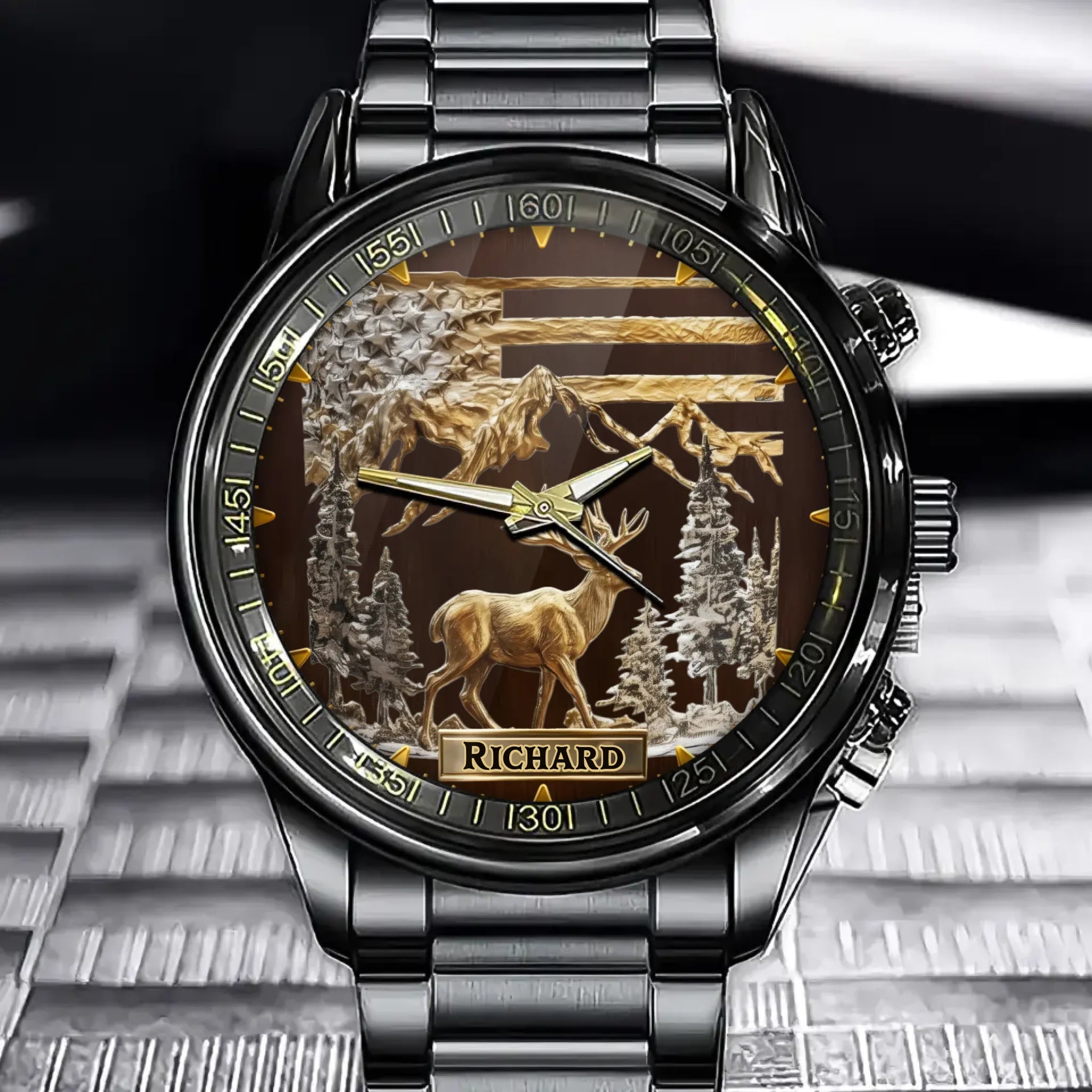Personalized Wildlife Explorer Gold Deer Watch – Golden Forest & American Flag Series
